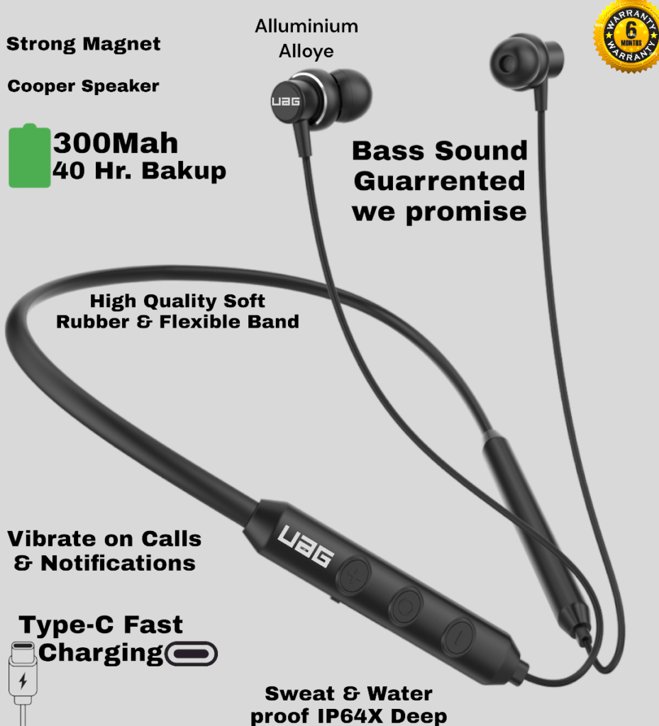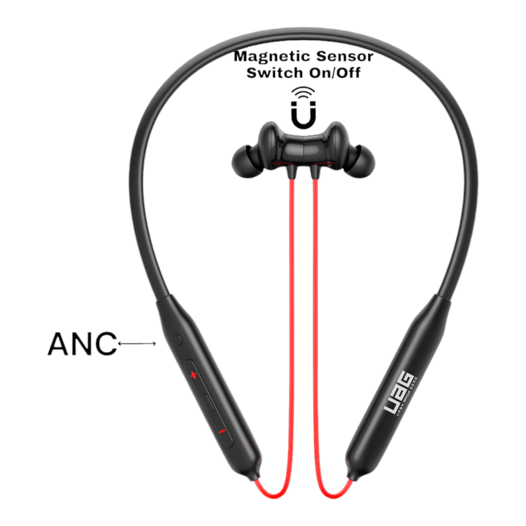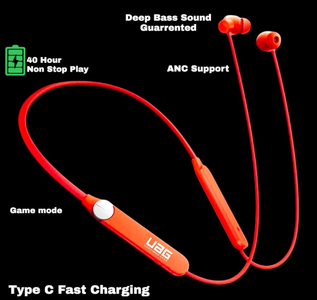 UAG Urbn Armour Gear Bullet z2 ANC Gaming & Music Magnetic Sensor ON/OFF Feature orignal Luxury Ultimate Design with Grey colour neckband which is comes with Deep Bass sound ANC protect feature OR Anti Dust Water ipx64 proof with Red safety OR 50hour battery backup. Bluetooth Connectivity: The neckband would have Bluetooth technology built into it, allowing it to connect wirelessly to other Bluetooth-enabled devices such as smartphones, tablets, or computers. This would enable the user to listen to music, take phone calls, or use other audio features without being tethered by wires. Magnetic Sensor On-Off: The magnetic sensor on-off feature could serve multiple purposes: Power Control: The neckband could have a magnetic switch that turns the device on or off. When the two ends of the neckband come together (where the magnets are located), it triggers the sensor to turn the device on. Conversely, separating the ends would turn it off. This feature can make it easy to power the device on or off with a simple gesture. Call Answer/End: Additionally, the magnetic sensor could be used to answer or end phone calls. For example, bringing the two ends of the neckband together could answer an incoming call, while separating them could end the call. Convenience and User Experience: Incorporating a magnetic sensor on-off feature adds convenience and improves the user experience by providing a simple and intuitive way to control the device’s power and certain functions without the need for physical buttons or complex gestures. Such a Bluetooth neckband with a magnetic sensor on-off feature would offer users a wireless and hassle-free audio experience with added functionality for easy control and management
