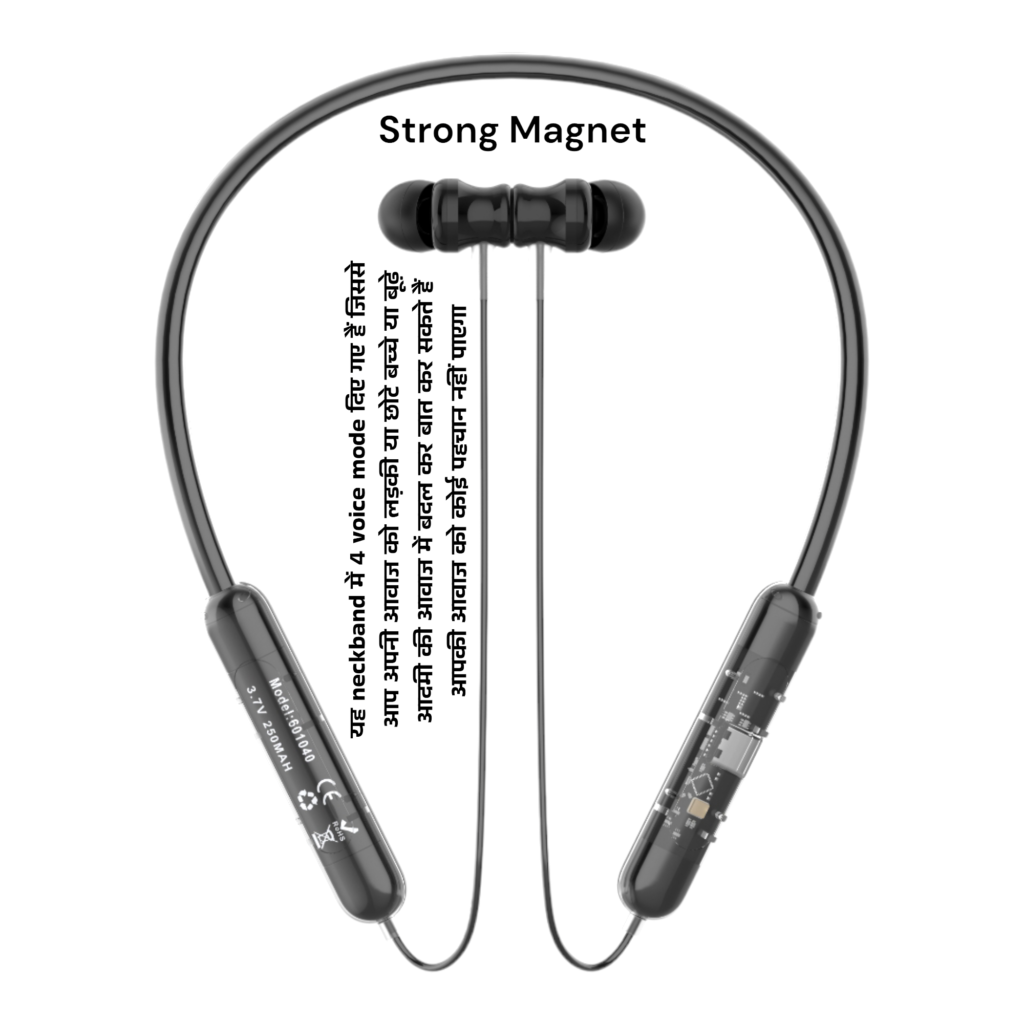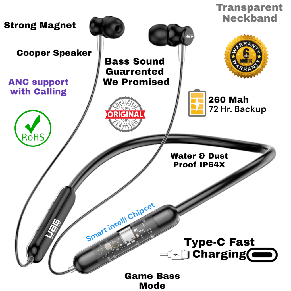 UAG Urbn Armour Gear Bullet z3 ANC Gaming & Music Magnetic Sensor ON/OFF Feature orignal Luxury Ultimate Design with Uniqe Black colour neckband which is comes with Deep Bass sound ANC protect feature OR Anti Dust Water ipx64 proof with Red safety OR 50hour battery backup. Bluetooth Connectivity: The neckband would have Bluetooth technology built into it, allowing it to connect wirelessly to other Bluetooth-enabled devices such as smartphones, tablets, or computers. This would enable the user to listen to music, take phone calls, or use other audio features without being tethered by wires. Magnetic Sensor On-Off: The magnetic sensor on-off feature could serve multiple purposes: Power Control: The neckband could have a magnetic switch that turns the device on or off. When the two ends of the neckband come together (where the magnets are located), it triggers the sensor to turn the device on. Conversely, separating the ends would turn it off. This feature can make it easy to power the device on or off with a simple gesture. Call Answer/End: Additionally, the magnetic sensor could be used to answer or end phone calls. For example, bringing the two ends of the neckband together could answer an incoming call, while separating them could end the call. Convenience and User Experience: Incorporating a magnetic sensor on-off feature adds convenience and improves the user experience by providing a simple and intuitive way to control the device’s power and certain functions without the need for physical buttons or complex gestures. Such a Bluetooth neckband with a magnetic sensor on-off feature would offer users a wireless and hassle-free audio experience with added functionality for easy control and management
